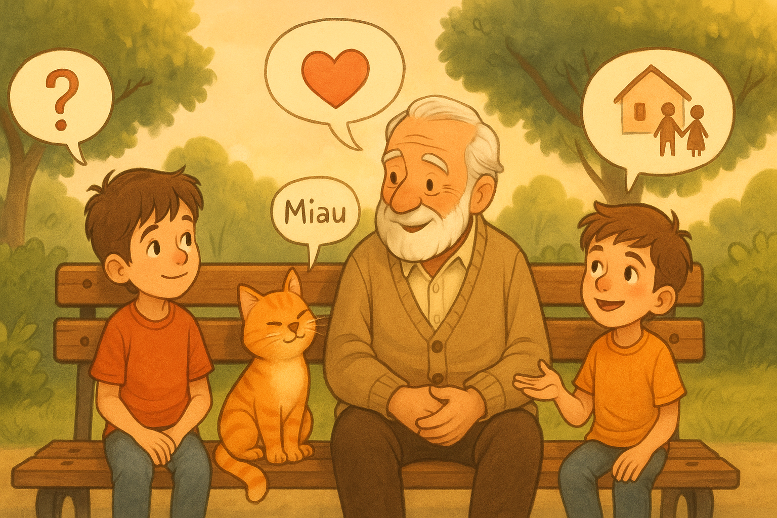 E os três ficaram ali, no banco da praça, ouvindo o vento, vendo o céu mudar de cor… com o coração quentinho, entendendo um pouquinho mais da vida.